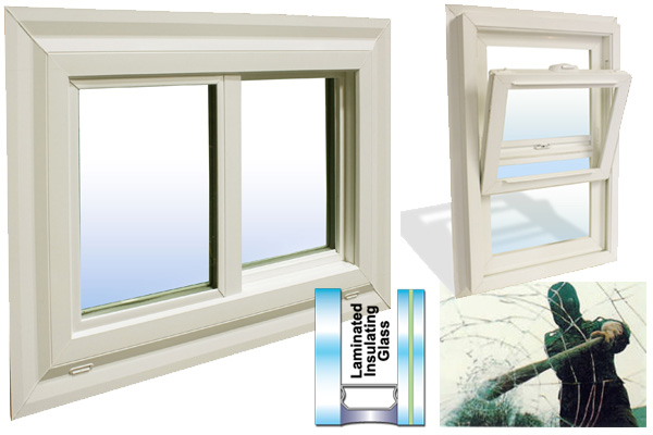 Dual Pane 1” insulated Glass Unit with laminated glass which is Extremely difficult to break. Ordinary annealed glass breaks easily Tempered glass, while stronger, shatters under a greater impact But laminated glass is different If laminated glass is broken. the vinyl interlayer remains in the frame, with glass fragments adhere to the interlayer This provides a strong barrier against forced entry and cannot be cut from one side only, which renders glasscutters useless.